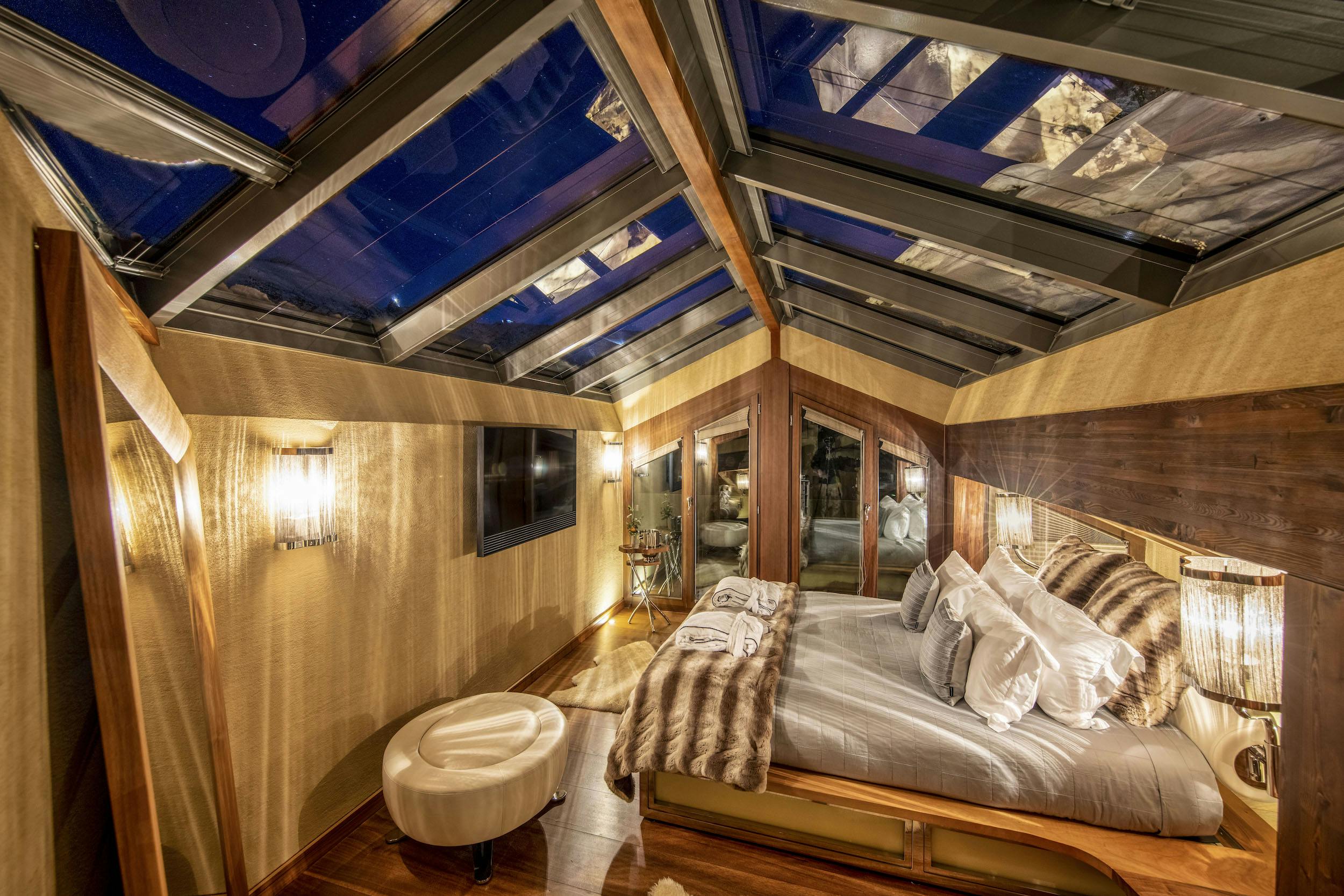 Panoramic Living Areas: Open-plan spaces with floor-to-ceiling windows, a glass roof, a large wrap-around sofa, and an open fireplace—perfect for relaxing and taking in the stunning views.